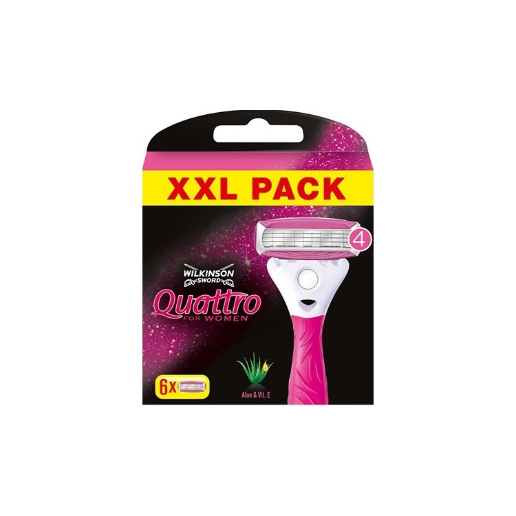 Der Quattro for Women ist unser zuverlässigster Beauty-Begleiter und eignet sich auch als Einstiegsrasierer wunderbar. Die Quattro for Women Wechselklingen garantieren, dass du lange Freude an deinem Rasierer hast. Was unsere Quattro for Women Rasierklingen so besonders macht? Zum Beispiel der kompakte Klingenkopf, der sich den Konturen deines Körpers perfekt anpasst. Die vier ultradünnen Klingen sind mit Schutzbügeln ausgerüstet, die deine Haut während der Rasur vor Schnittverletzungen schützen. Zusätzlich bringen zwei in den Klingenkopf integrierte Gleitstreifen mit Aloe vera und Vitamin E den extra Pflegefaktor ins Spiel.
